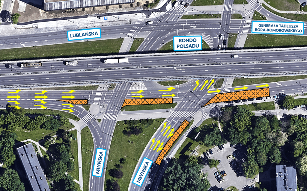 - On Młyńska Street, the right-turn lane onto Bora Komorowskiego Street will be deactivated. The current right-turn lane will serve both straight and right-turn purposes (toward Bora Komorowskiego Avenue).