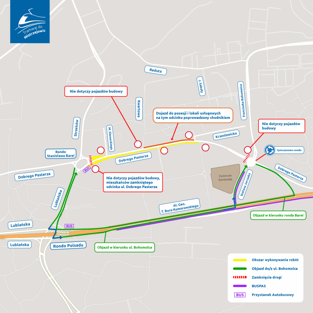 Mieszkańcy okolicznych osiedli będą wciąż mieli możliwość przejazdu do posesji drogami osiedlowymi. Dla mieszkańców budynków oraz klientów lokali usługowych znajdujących się na ulicy Dobrego Pasterza, do których nie ma możliwości dojazdu przez drogi osiedlowe, zapewniona zostanie możliwość przejazdu ciągiem pieszo-jezdnym po północnej stronie ulicy. Piesi będą mogli również poruszać się chodnikiem po południowej stronie ulicy, znajdującym się między blokami mieszkalnymi a torowiskiem.