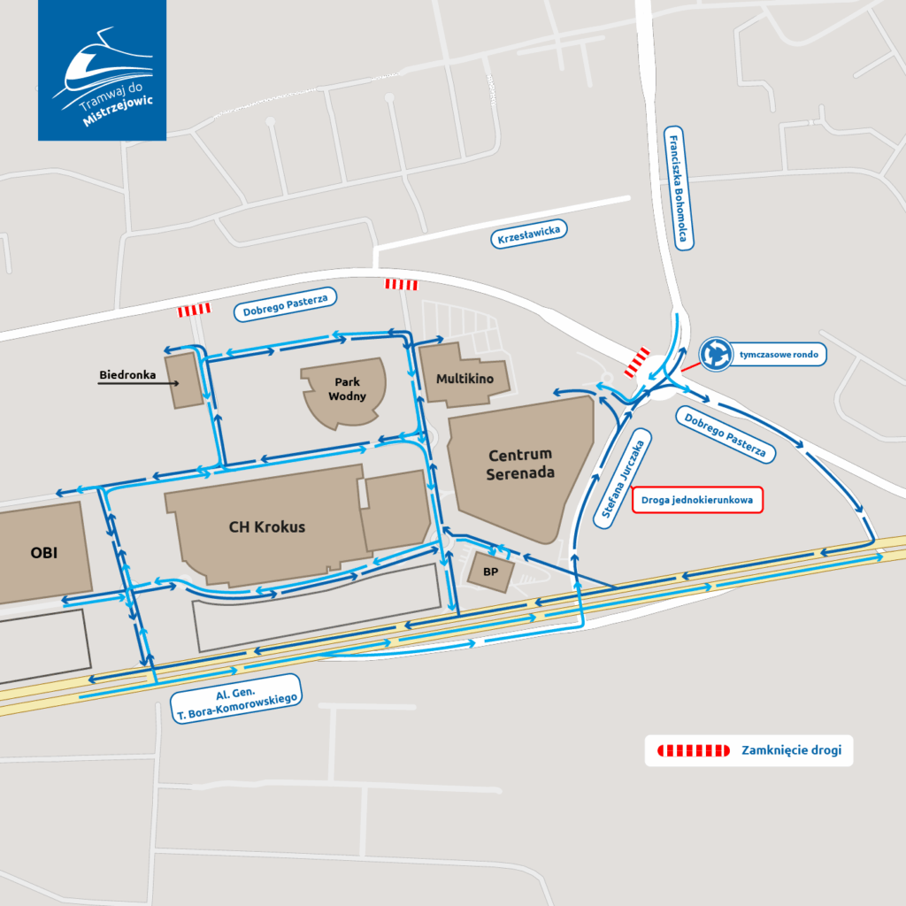 Aby ułatwić poruszanie się po okolicy, przygotowaliśmy mapkę z dojazdami do centrów handlowych Serenada, Krokus, Parku Wodnego, Biedronki, Multikina i innych lokali usługowych.