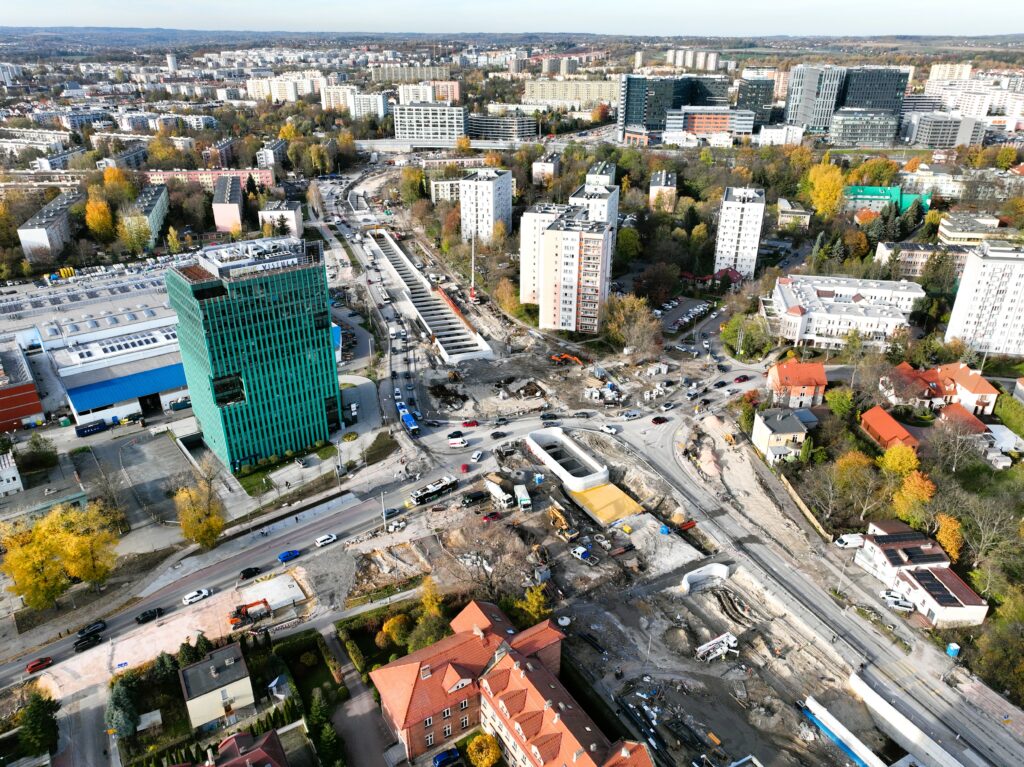 Most work was focused around the intersection of al. Jana Pawła II and Mogilska, where under-track crossings, storm water drainage, and gas line reconstructions were completed. A storm water chamber is under construction on Śliczna Street. On Chałupnika Street, sewer redirection work was completed. Storm water drainage is now being built on Bohomolca Street, and manhole and inlet adjustments are ongoing along the entire investment route.
