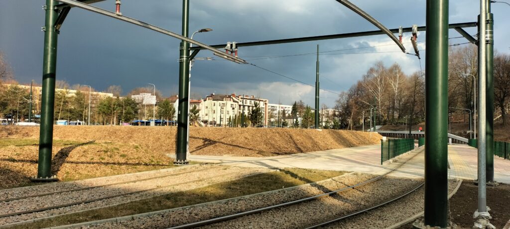 Zaprojektowaliśmy ją tak, aby obsługiwała oba kierunki – zarówno tramwaje przyjeżdżające ze starej trasy, od ulicy Srebrnych Orłów, jak i z nowej, od ulicy Bohomolca. Znajdziemy tam teraz dwa tory postojowo-odjazdowe, czyli takie, na których tramwaje mogą się zatrzymać i przeczekać do czasu ruszenia z przystanku. Łącznie zamontowaliśmy tam aż 1013 metrów torów.