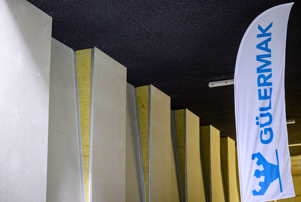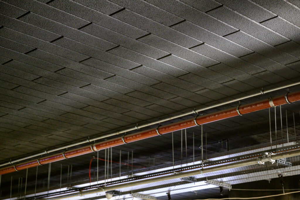 Na tym samym poziomie zakończyliśmy już montaż okładzin sufitowych. W projekcie zastosowano dwa rozwiązania: natryskowy sufit akustyczny oraz panele z wełny mineralnej w ciemnej kolorystyce. Ich funkcją jest poprawa akustyki przestrzeni – ograniczenie hałasu z przejeżdżających tramwajów oraz zapewnienie odpowiednich warunków nagłośnienia.